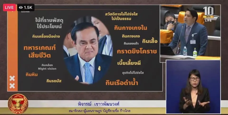 สส.ฝ่ายค้านพรรคก้าวไกลอภิปรายดึกๆตอนเที่ยงคืน ทำข้อมูลอภิปรายประยุทธ์ที่เป็นรัฐมนตรีกลาโหมได้ดี ถามประยุทธ์ถึงการจัดซื้อจัดจ้างข้าวของเครื่องใช้ให้กำลังพล ตั้งแต่กางเกงใน ถุงเท้า รองเท้า เสื้อยืด กางเกงขาสั้น ที่ซื้อแพงกว่าราคาทั่วไปถึง 47 %ทุกรายการ ทั้งที่ซื้อจำนวนมากกว่า ซื้อเป็นหมื่นเป็นแสนตัวแทนที่ราคาจะถูกลง ราคากลับแพงกว่าที่ชาวบ้านซื้อชนิดและแบบเดียวกันเพียง 1 ตัว และแพงกว่าทุกรายการแบบบวก 47 % ทุกรายการ