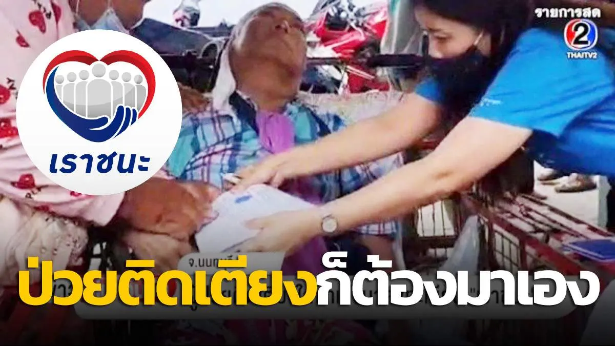 โดยนางสุนันทา แสงเอม อายุ 53 ปี และ น.ส.ขวัญไพร แสงเอม อายุ 30 ปี บุตรสาว ได้พานายจรัญ แสงเอม อายุ 60 ปี ผู้ป่วยโรคไต ซึ่งป่วยติดเตียงมานานกว่า 12 ปี ด้วยการนอนอยู่ในรถซาเล้งมาทำการลงทะเบียนเราชนะ