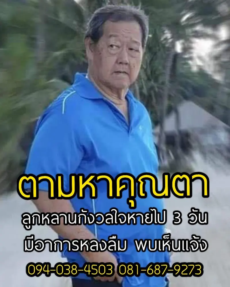 ทางญาติแจ้งว่าการขึ้นโพสต์ครั้งนี้จะทำให้ได้เจอคุณตาเพราะเห็นถึงพลังจากคนในเพจ หลังจากที่ตามหามา 2 วันก็ยังไม่พบตัว ตาหายออกจากจันทบุรี พร้อมรถ จยย. มีอาการหลงๆ ลืมๆ และไม่เคยไปไหนไกลมาก
