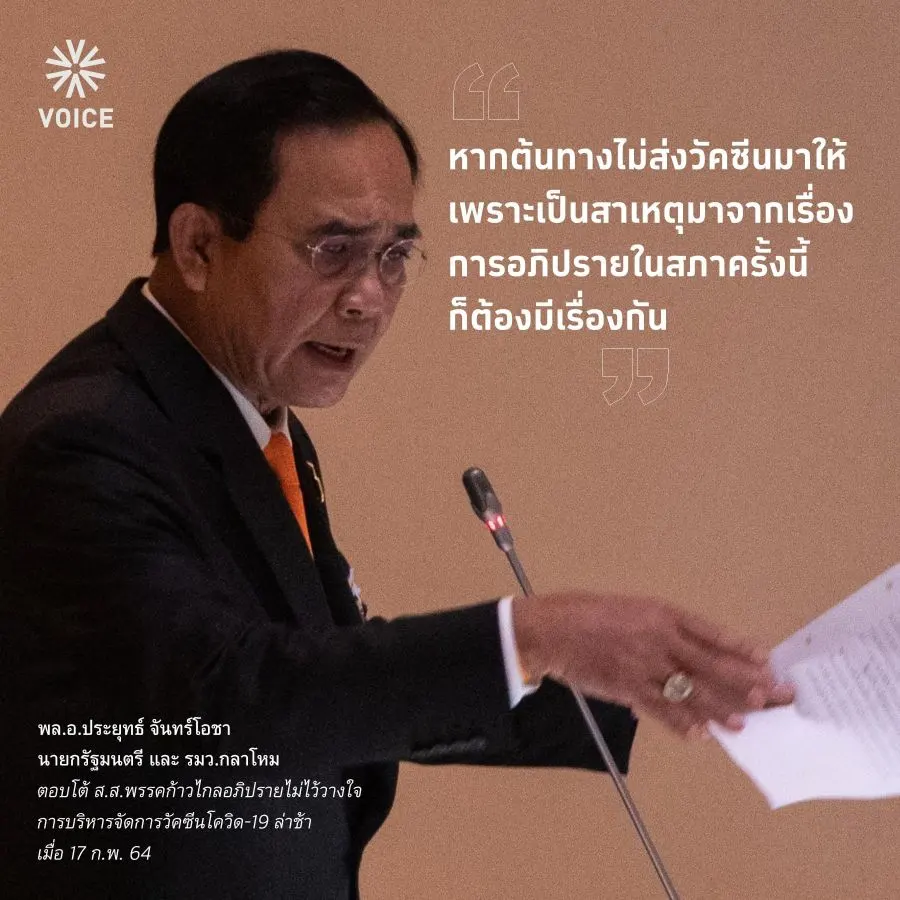 ประยุทธ์ลั่น "หากต้นทางไม่ส่งวัคซีนมาให้เพราะเป็นสาเหตุมาจากเรื่องการอภิปรายในสภาครั้งนี้ก็ต้องมีเรื่องกัน