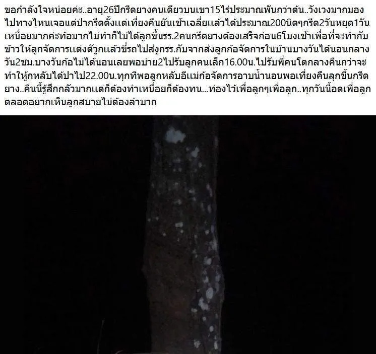 อายุ26ปีกรีดยางคนเดียวบนเขา15ไร่ประมาณพันกว่าต้น..วังเวงมากมองไปทางไหนเจอแต่ป่ากรีดตั้งเเต่เทึ่ยงคืนยันเช้าเฉลี่ยเเล้วได้ประมาณ200นิดๆกรีด2วันหยุด1วันเหนื่อยมากค่ะท้อมากไม่ทำก็ไม่ได้ลูกขึ้นรร.2คนกรีดยางต้องเสร็จก่อน6โมงเช้าเพื่อที่จะทำกับข้าวให้ลูกจัดการเเต่งตัวูกเเล้วขี่รถไปส่งูกรร.กับจากส่งลูกก้อจัดการในบ้านบางวันได้นอนกลางวัน2ชม.บางวันก้อไม่ได้นอนเลยพอบ่าย2ไปรับลูกคนเล็ก16.00น.ไปรับพี่คนโตกลางคืนกว่าจะทำใหู้กหลับได้ปาไป22.00น.ทุกทีพอลูกหลับอีเเม่ก้อจัดการอาบน้ำนอนพอเที่ยงคืนลุกขึ้นกรีดยาง..คืนนี้รู้สึกกลัวมากเเต่ก็ต้องทำเหนื่อยก็ต้องทน...ท่องไว้เพื่อลูกๆเพื่อลูก..ทุกวันนี้อดเพื่อลูกตลอดอยากเห็นลูกสบายไม่ต้องลำบาก