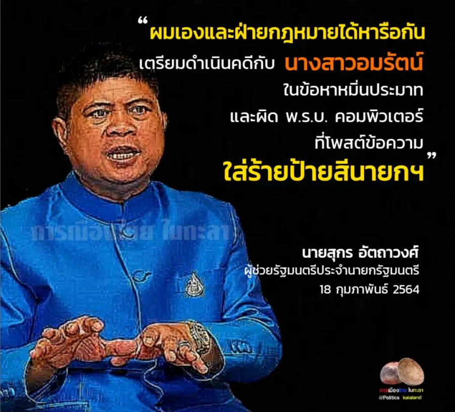 "ขอแนะนางสาวอมรัตน์ และพรรคก้าวไกล หากอยากเข้ามาเป็นรัฐบาลจนตัวสั่น ก็ขอให้ไปพัฒนาตัวเองหรือพรรคก่อน มีสติเล่นการเมืองให้สร้างสรรค์กว่านี้ ไม่ใช่จะออกมาด่าคนอื่น หรือ จาบจ้วงสถาบันอย่างเดียว โดยไม่ทำประโยชน์เพื่อบ้านเมืองเลย จนคนเกือบทั้งประเทศเกลียดชัง ซึ่งคนประเภทนี้มองว่าอย่าหวังแต่จะเข้ามาบริหารประเทศเลย เลือกตั้งครั้งหน้าประชาชนจะให้ความไว้วางใจเข้ามาทำหน้าที่ในสภาฯอีกหรือไม่ก็ไม่รู้ ตนจึงมีความจำเป็นต้องให้ฝ่ายกฎหมายดำเนินคดีให้เข็ดหลาบไม่ให้เป็นเยี่ยงอย่างต่อคนอื่น ในพฤติกรรมก้าวร้าวใส่ร้ายป้ายสี ไม่ยึดหลักฎหมายบ้านเมืองเลยสักนิด"