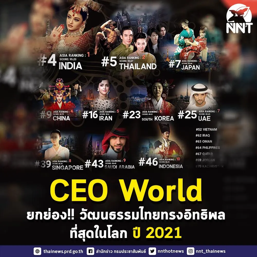 นิตยสาร CEO World จัดอันดับประเทศที่มีมรดกทางวัฒนธรรมทรงอิทธิพลที่สุดในโลกปี 2021 ให้ประเทศไทย #Thailand อยู่ในอันดับที่ 5 และเป็นอันดับ 2 ของเอเชีย