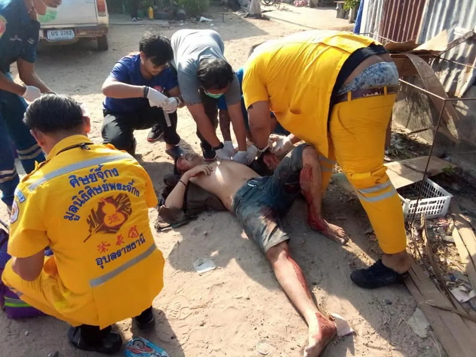 โดยจุดเกิดเหตุอยู่บริเวณลานดินใกล้บ้านผู้ต้องหา พบเสื้อเปื้อนเลือกตกอยู่ 1 ตัว มีดใช้หั่นเนื้อสเต็ก 1 เล่ม ปลอกกระสุนขนาด 9 ม.ม. 2 ปลอก ส่วนผู้บาดเจ็บจำนวน 2 ราย ทราบชื่อ ด.ต.ผดุง บุตรสาร ผบ.หมู่งานสืบสวน สภ.เมืองอุบลราชธานี ถูกแทงด้วยมีดดังกล่าวเข้าที่หน้าอกด้านขวา 1 แห่ง และนายทศพร สุพรรณ์ อายุ 29 ปี ผู้ก่อเหตุถูกยิงด้วยกระสุนปืนขนาด 9 ม.ม.ที่ขาขวา และชายโครงซ้ายอย่างละ 1 นัด เจ้าหน้าที่หน่วยกู้ภัยได้นำตัวคนเจ็บทั้งสองส่งโรงพยาบาลสรรพสิทธิประสงค์ให้แพทย์รักษา