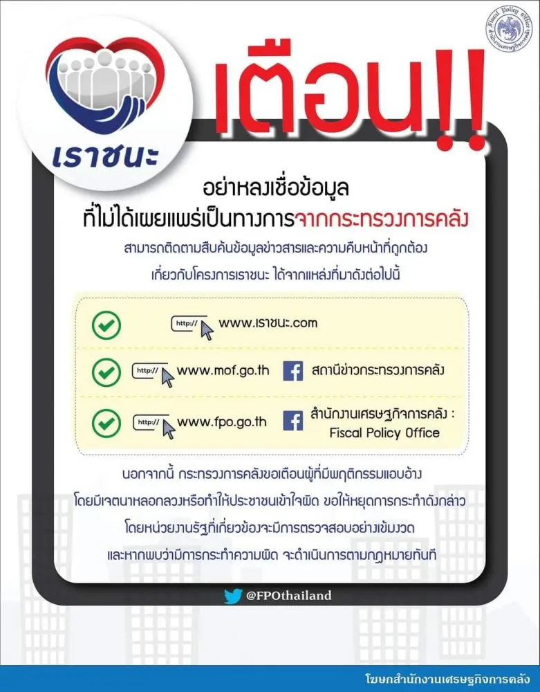 เพื่อมิให้เกิดความสับสนและความเข้าใจผิดเกี่ยวกับมาตรการเยียวยาโครงการ “เราชนะ” ของรัฐบาล จึงขอให้ประชาชนระมัดระวังในการอ่าน ส่ง หรือแชร์ข้อมูลต่าง ๆ ที่มิได้ถูกเผยแพร่อย่างเป็นทางการจากกระทรวงการคลัง นอกจากนี้ กระทรวงการคลังขอเตือนผู้ที่มีพฤติกรรมแอบอ้างโดยมีเจตนาหลอกลวงหรือทำให้ประชาชนเข้าใจผิด ขอให้หยุดการกระทำดังกล่าว โดยหน่วยงานรัฐที่เกี่ยวข้องจะมีการตรวจสอบอย่างเข้มงวด และหากพบว่ามีการกระทำความผิดจะดำเนินการตามกฎหมายทันที