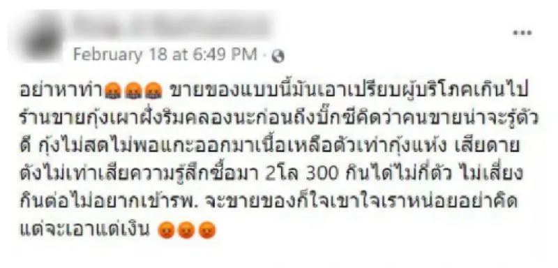 เจ้าตัวบอกว่า คนขายน่าจะรู้ตัวดีว่ากุ้งเน่ า ไม่ส ด แต่ยังเอามาเผาขาย โวยเอาเปรียบลูกค้า และเห็นแก่เงินมากเกินไป