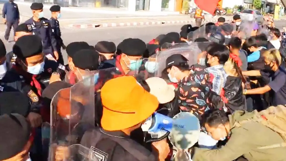ขอนแก่นคึกคัก ผู้ชุมนุม กลุ่มราษฎร โขง ชี มูล ร่วมแกนนำ ขอนแก่นพอกันที ดาวดิน ภาคีเครือข่ายนักเรียน kkc รวมตัวอ่านแถลงการณ์เดินขบวนเรียกร้อง 4 ข้อ เจอตร.ขวางให้เดินช่องเดียว ผลัก-ดันยื้อกันวุ่น ระหว่างการเตรียมการเดินขบวนนั้น ปรากฎว่าเกิดการกระทบกระทั่งกันระหว่างตำรวจชุดควบคุมฝูงชนกับกลุ่มการ์ด เนื่องจากกลุ่มผู้ชุมนุมพยายามจะเดินขบวนเต็มทุกช่องทางการจราจร แต่ตำรวจอนุญาตให้เดินขบวนได้ 1 ช่องทางเท่านั้นซึ่งได้เจรจากับแกนนำไว้แล้ว ทำให้เกิดการผลักดันแย่งโล่เพื่อเปิดทาง แต่ตำรวจยังคงตรึงกำลังกั้นแนวไว้อย่างเข้มงวด เพื่อให้ผู้ชุมนุมเดินขบวนได้ในช่องทางที่กำหนดไม่กีดขวางการจราจร