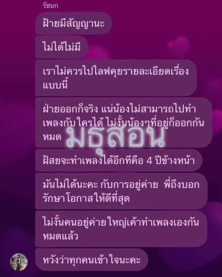 #สัญญาทาส จากประเด็นล่าสุดที่มีเด็กในค่ายได้หมดถ้าสดชื่นออกจากค่าย ก็มีแชทหลุดมาให้ประชาชนได้แซ่บกัน 1ในประเด็นนั้นก็คือเด็กในค่ายทุกคนต้องจ่ายค่าน้ำค่าไฟเองทุกเดือน รวมไปถึงเรียกเก็บเงินจากเด็กในค่ายที่หาได้น้อยนิดไปจ่ายค่าจ้างคนมาถูบ้าน! โถ...... ไหนบอกอยู่ฟรีกินฟรีทุกอย่างคะ? ละบ้านที่พักก็ไม่ได้ให้อยู่แบบสวยหรูอย่างที่ทุกคนเข้าใจ! เช่าให้เด็กในค่ายอยู่พร้อมพัดลม2ตัว กับข้าวก็ต้องปูเสื่อทำกินเองเพราะบ้านที่เช่าให้อยู่ไกลจากตัวบ้านที่ตัวเองอยู่! คุณภาพชีวิตศิลปินอยู่ไหนคะขอถาม? และสัญญาศิลปินนี่สัญญาทาสหรือปล่าวคะ? หลังจากออกจากค่ายแล้วห้ามทำเพลง4ปี!!! คิดได้ยังไงอ่ะ จะไม่ให้เด็กลืมตาอ้าปากเลยหรือคะ?