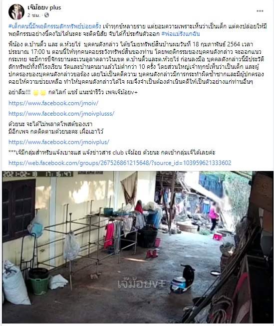 พี่น้อง ต.บ้านติ้ว และ ต.ห้วยไร่ บุคคนดังกล่าว ได้ขโมยทรัพย์สินบ้านผมวันที่ 18 กุมภาพันธ์ 2564 เวลาประมาณ 17:00 น ตอนนี้ให้ทุกคนคอยระวังทรัพย์สินของท่าน โดยพฤติกรรมของบุคคนดังกล่าว จะออกแนวกระเทย จะมีการขี่จักรยานตะเวนดูลาดลาวในเขต ต.บ้านติ้วและต.ห้วยไร่ ก่อนลงมือ บุคคลดังกล่าวนี้มีประวัติลักทรัพย์ทั้งที่โรงเรียน วัดและบ้านคนมาแล้วไม่ต่ำกว่า 10 ครั้ง โดยส่วนใหญ่เจ้าทุกข์เห็นว่าเป็นเด็ก และผู้ปกครองของบุคคนดังกล่าวขอร้อง เลยไม่เป็นคดีความ บุคคนดังกล่าวมีการกระทำผิดซ้ำซากและมีผู้ปกครองคอยให้ความช่วยเหลือ ทำให้บุคคนดังกล่าวได้ใจ ผมจึงจำเป็นต้องดำเนินคดีให้เป็นตัวอย่างแก่ท่านอื่นๆ
