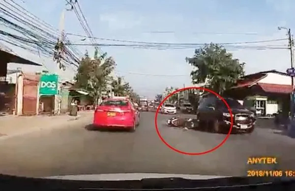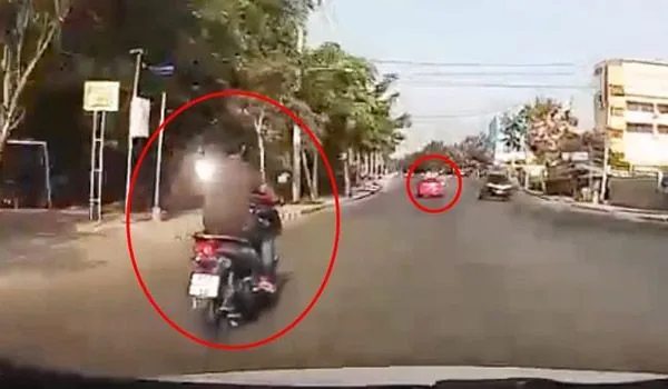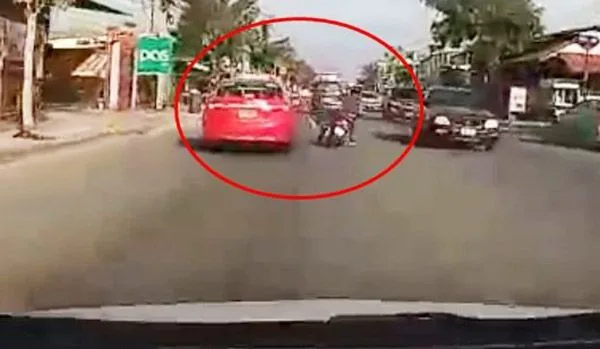 จากนั้น มอเตอร์ไซค์หัวร้อน ระงับโทสะไม่ไหว ได้ใช้เท้าบรรจงถีบไปที่รถแท็กซี่ขณะขี่มาตีคู่ แต่มอเตอร์ไซค์เจ้ากรรมดันเสียหลักล้มลงเสียเองจนเกือบถูกรถที่ขับสวนมาเหยียบเอา จนทำให้ผู้โพสต์พูดในคลิปว่า “เข้าบ้านไปก็จบแล้ว”