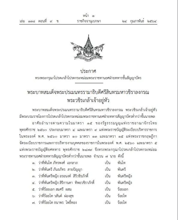 วันที่ 24 กุมภาพันธ์ 2564 ราชกิจจานุเบกษา เผยแพร่ประกาศ เรื่อง ทรงพระกรุณาโปรดเกล้าโปรดกระหม่อมพระราชทานยศฝ่ายทหารชั้นสัญญาบัตร พระบาทสมเด็จพระปรเมนทรรามาธิบดีศรีสินทรมหาวชิราลงกรณ พระวชิรเกล้าเจ้าอยู่หัว มีพระบรมราชโองการโปรดเกล้าโปรดกระหม่อมพระราชทานยศฝ่ายทหารสัญญาบัตรต่ำกว่าชั้นนายพล 7 ราย ดังนี้