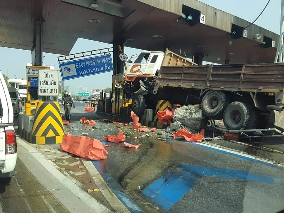 พังยับ รถบรรทุก ชนด่านค่าผ่านทาง