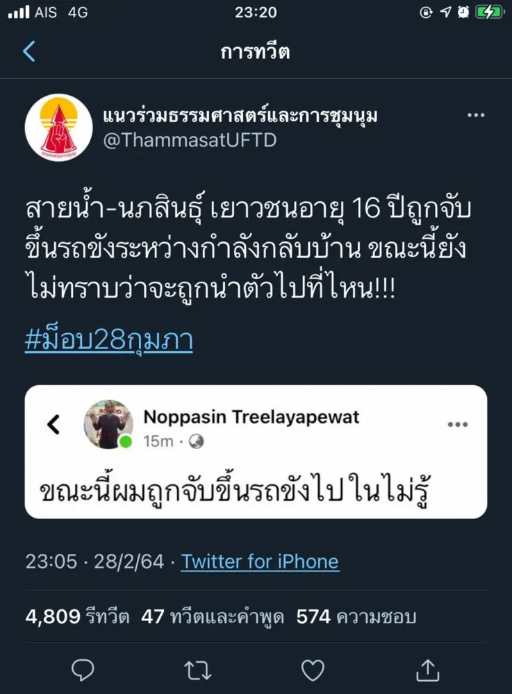 สายน้ำ-นภสินธุ์ เยาวชนอายุ 16 ปีถูกจับขึ้นรถขังระหว่างกำลังกลับบ้าน ขณะนี้ยังไม่ทราบว่าจะถูกนำตัวไปที่ไหน!!!