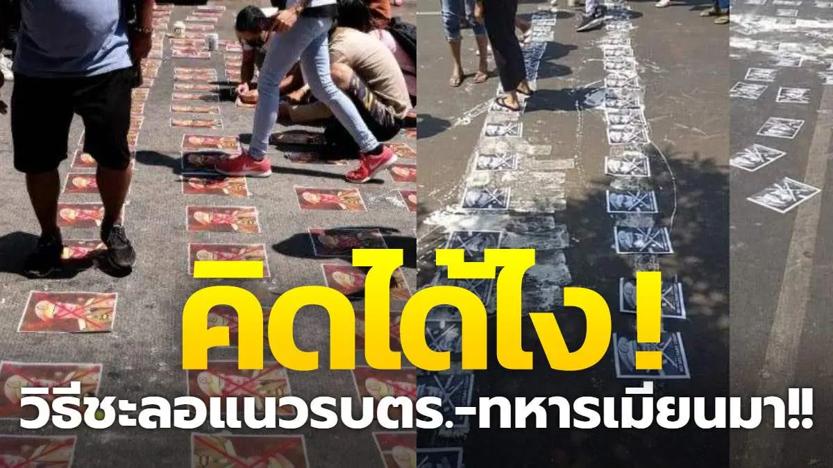 ผู้ชุมนุมในประเทศเมียนมา นำรูปของพล.อ. มิน อ่อง หล่าย ไปติดไว้บนพื้นถนน