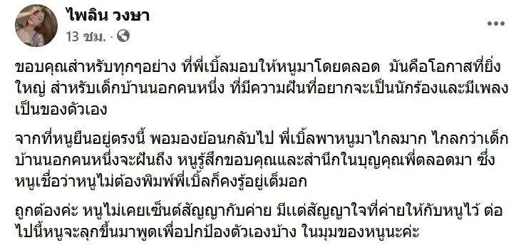 ถูกต้องค่ะ หนูไม่เคยเซ็นต์สัญญากับค่าย มีเเต่สัญญาใจที่ค่ายให้กับหนูไว้ ต่อไปนี้หนูจะลุกขึ้นมาพูดเพื่อปกป้องตัวเองบ้าง ในมุมของหนูนะค่ะ