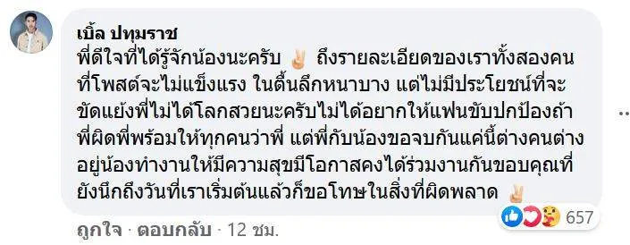 "พี่ดีใจที่ได้รู้จักน้องนะครับ ✌🏻 ถึงรายละเอียดของเราทั้งสองคนที่โพสต์จะไม่แข็งแรง ในตื้นลึกหนาบาง แต่ไม่มีประโยชน์ที่จะขัดแย้งพี่ไม่ได้โลกสวยนะครับไม่ได้อยากให้แฟนขับปกป้องถ้าพี่ผิดพี่พร้อมให้ทุกคนว่าพี่ แต่พี่กับน้องขอจบกันแค่นี้ต่างคนต่างอยู่น้องทำงานให้มีความสุขมีโอกาสคงได้ร่วมงานกันขอบคุณที่ยังนึกถึงวันที่เราเริ่มต้นแล้วก็ขอโทษในสิ่งที่ผิดพลาด