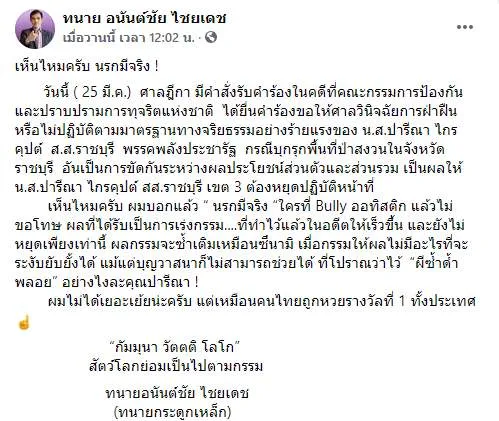 ซึ่งทางด้านเพจ ทนาย อนันต์ชัย ไชยเดช ได้โพสต์เรื่องนี้โดยระบุไว้ว่า