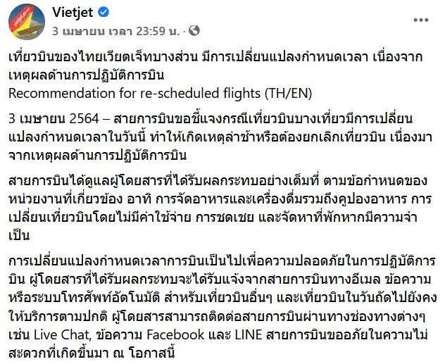 เที่ยวบินของไทยเวียตเจ็ทบางส่วน มีการเปลี่ยนแปลงกำหนดเวลา เนื่องจากเหตุผลด้านการปฏิบัติการบิน