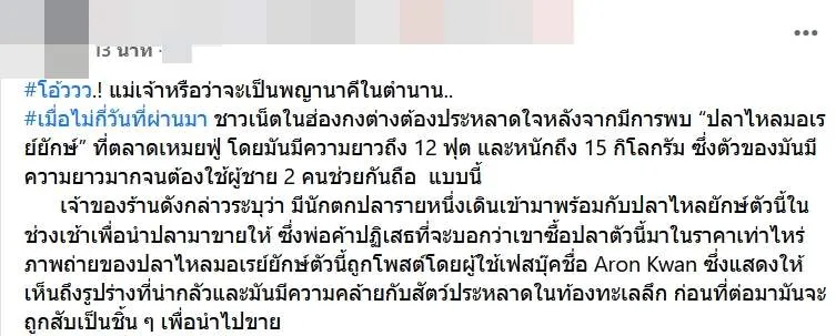 เมื่อไม่กี่วันที่ผ่านมา ชาวเน็ตในฮ่องกงต่างต้องประหลาดใจหลังจากมีการพบ “ปลาไหลมอเรย์ยักษ์” ที่ตลาดเหมยฟู่ โดยมันมีความยาวถึง 12 ฟุต และหนักถึง 15 กิโลกรัม ซึ่งตัวของมันมีความยาวมากจนต้องใช้ผู้ชาย 2 คนช่วยกันถือ แบบนี้