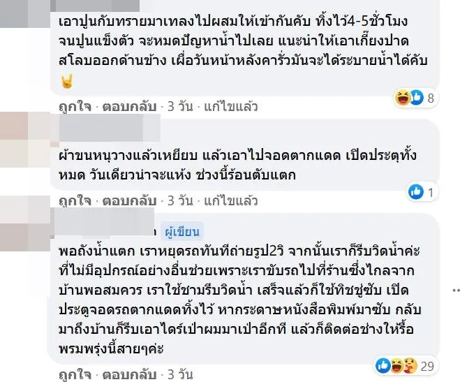 พอถังน้ำแตก เราหยุดรถทันทีถ่ายรูป2วิ จากนั้นเราก็รีบวิดน้ำค่ะ ที่ไม่มีอุปกรณ์อย่างอื่นช่วยเพราะเราขับรถไปที่ร้านซึ่งไกลจากบ้านพอสมควร เราใช้ชามรีบวิดน้ำ เสร็จแล้วก็ใช้ทิชชู่ซับ เปิดประตูจอดรถตากแดดทิ้งไว้ หากระดาษหนังสือพิมพ์มาซับ กลับมาถึงบ้านก็รีบเอาไดร์เป่าผมมาเป่าอีกที แล้วก็ติดต่อช่างให้รื้อพรมพรุ่งนี้สายๆค่ะ