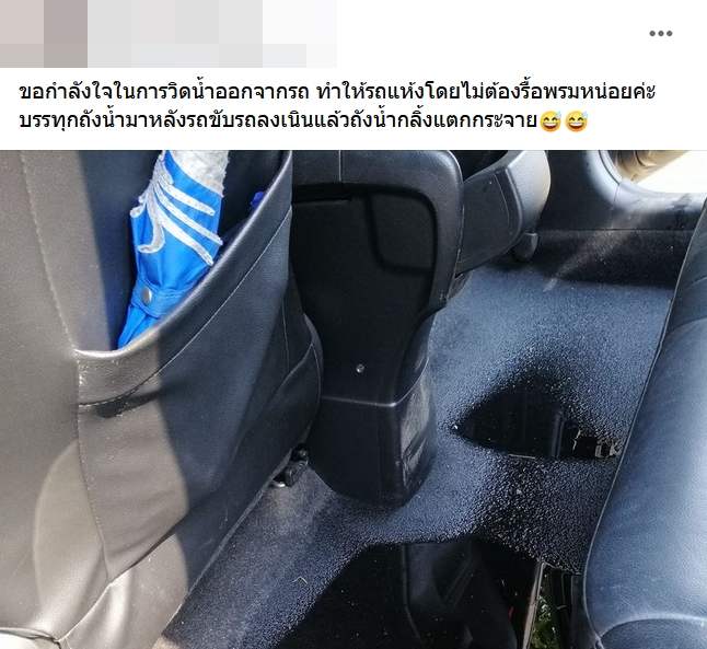 ขอกำลังใจในการวิดน้ำออกจากรถ ทำให้รถแห้งโดยไม่ต้องรื้อพรมหน่อยค่ะ บรรทุกถังน้ำมาหลังรถขับรถลงเนินแล้วถังน้ำกลิ้งแตกกระจาย