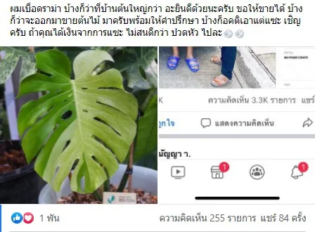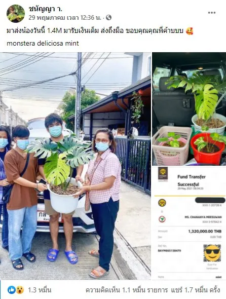 ซึ่งในโพสต์ดังกล่าวระบุข้อความว่า “มาส่งน้องวันนี้ 1.4M มารับเงินเต็ม ส่งถึงมือ ขอบคุณคุณพี่ค้าบบบ monstera deliciosa mint” พร้อมภาพประกอบซึ่งเป็นภาพต้นมอนสเตอร่า ขนาดไม่เล็ก ไม่ใหญ่ แต่ที่สังเกตได้คือ บริเวณใบมีลักษณะด่างตรงตามลักษณะของต้นไม้ราคาแพง