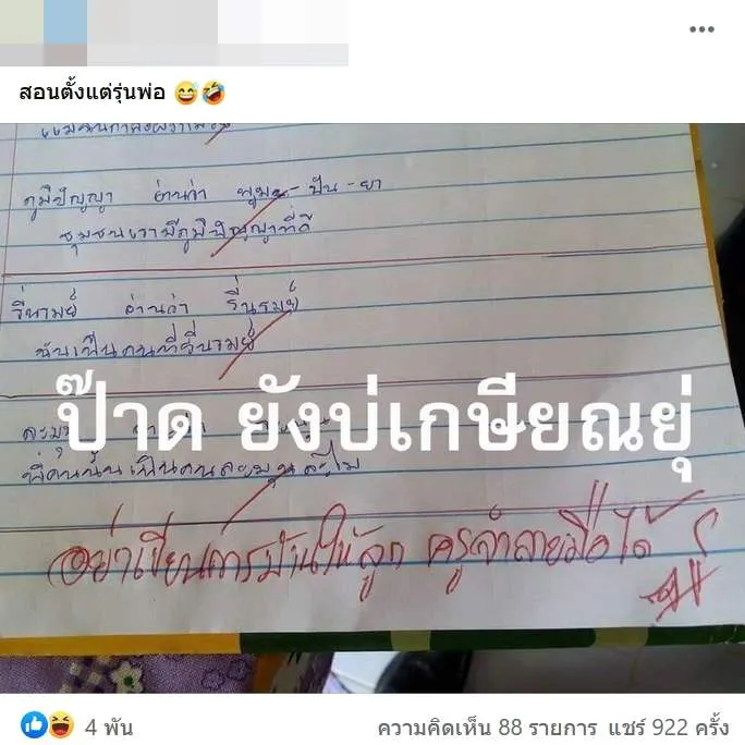 มีผู้ใช้เฟสบุ๊กได้แชร์ภาพ ของการบ้านของนักเรียนคนหนึ่ง ที่ตรวจแล้ว และมีลายมือของครูเขียนด้วยหมึกแดง