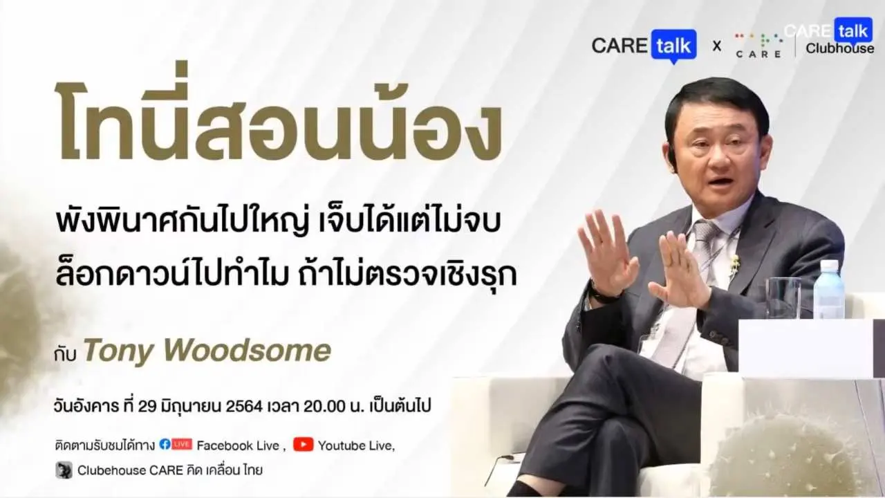 เมื่อเวลา 20.01 น. วันที่ 29 มิถุนายน โทนี วู้ดซัม หรือ นายทักษิณ ชินวัตร อดีตนายกรัฐมนตรี ได้ร่วมสนทนาในรายการ CARE ClubHouse x CARE Talk ตอน “โทนีสอนน้อง” พังพินาศกันไปใหญ่ เจ็บได้แต่ไม่จบ ล็อกดาวน์ไปทำไม ถ้าไม่ตรวจเชิงรุก