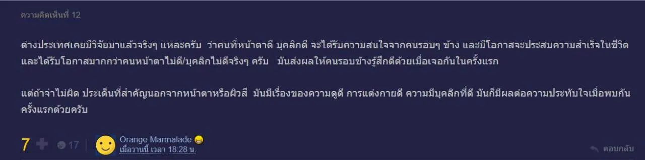 แต่ถ้าจำไม่ผิด ประเด็นที่สำคัญนอกจากหน้าตาหรือผิวสี มันมีเรื่องของความดูดี การแต่งกายดี ความมีบุคลิกที่ดี มันก็มีผลต่อความประทับใจเมื่อพบกันครั้งแรกด้วยครับ