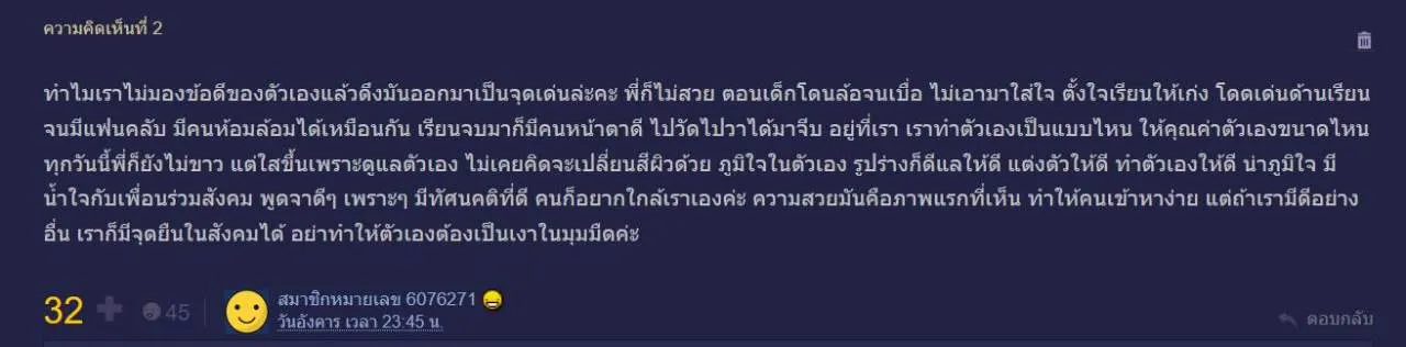 ทำไมเราไม่มองข้อดีของตัวเองแล้วดึงมันออกมาเป็นจุดเด่นล่ะคะ พี่ก็ไม่สวย ตอนเด็กโดนล้อจนเบื่อ ไม่เอามาใส่ใจ ตั้งใจเรียนให้เก่ง โดดเด่นด้านเรียนจนมีแฟนคลับ มีคนห้อมล้อมได้เหมือนกัน เรียนจบมาก็มีคนหน้าตาดี ไปวัดไปวาได้มาจีบ อยู่ที่เรา เราทำตัวเองเป็นแบบไหน ให้คุณค่าตัวเองขนาดไหน ทุกวันนี้พี่ก็ยังไม่ขาว แต่ใสขึ้นเพราะดูแลตัวเอง ไม่เคยคิดจะเปลี่ยนสีผิวด้วย ภูมิใจในตัวเอง รูปร่างก็ดีแลให้ดี แต่งตัวให้ดี ทำตัวเองให้ดี น่าภูมิใจ มีน้ำใจกับเพื่อนร่วมสังคม พูดจาดีๆ เพราะๆ มีทัศนคติที่ดี คนก็อยากใกล้เราเองค่ะ ความสวยมันคือภาพแรกที่เห็น ทำให้คนเข้าหาง่าย แต่ถ้าเรามีดีอย่างอื่น เราก็มีจุดยืนในสังคมได้ อย่าทำให้ตัวเองต้องเป็นเงาในมุมมืดค่ะ