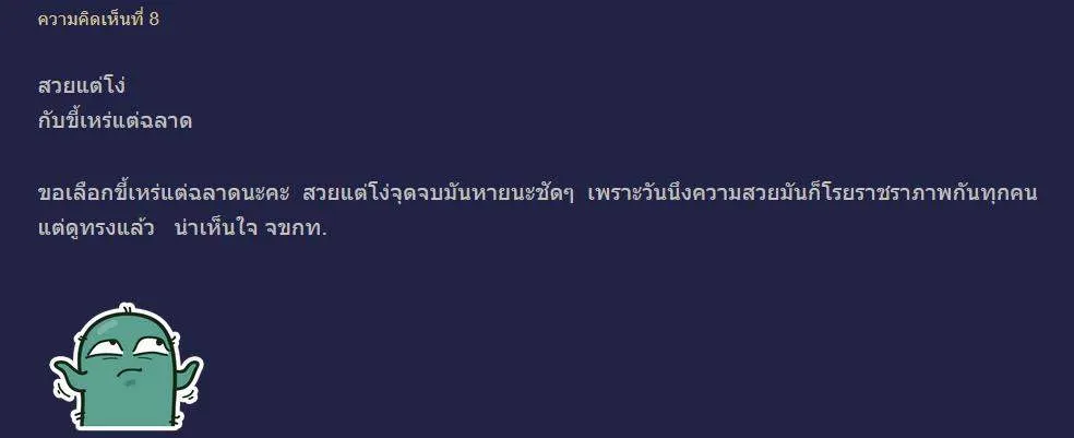 ขอเลือกขี้เหร่แต่ฉลาดนะคะ สวยแต่โง่จุดจบมันหายนะชัดๆ เพราะวันนึงความสวยมันก็โรยราชราภาพกันทุกคน