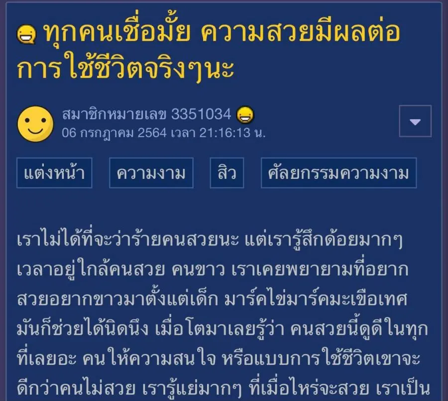 เราไม่ได้ที่จะว่าร้ายคนสวยนะ แต่เรารู้สึกด้อยมากๆเวลาอยู่ใกล้คนสวย คนขาว เราเคยพยายามที่อยากสวยอยากขาวมาตั้งแต่เด็ก มาร์คไข่มาร์คมะเขือเทศ มันก็ช่วยได้นิดนึง เมื่อโตมาเลยรู้ว่า คนสวยนี้ดูดีในทุกที่เลยอะ คนให้ความสนใจ หรือแบบการใช้ชีวิตเขาจะดีกว่าคนไม่สวย เรารู้แย่มากๆ ที่เมื่อไหร่จะสวย เราเป็นแบบนี้หลายปีมากๆ ที่ชอบมานอนร้องไห้เรื่องไม่สวยผิวดำ ก็คงเพราะเมื่อก่อน เคยโดนบูลลี่ เพื่อนว่าเรา ว่าแมวโพรง ดำ มันรู้สึกแย่มากๆ