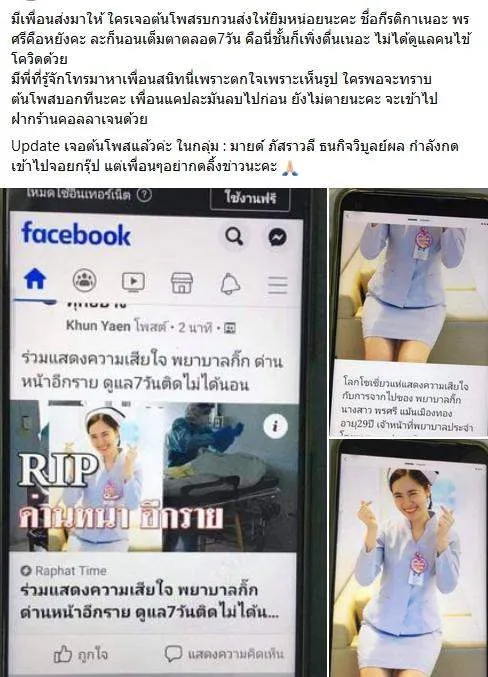 มีเพื่อนส่งมาให้ ใครเจอต้นโพสรบกวนส่งให้ยิมหน่อยนะคะ ชื่อกีรติกาเนอะ พรศรีคือหยังคะ ละก็นอนเต็มตาตลอด7วัน คือนี่ชั้นก็เพิ่งตื่นเนอะ ไม่ได้ดูแลคนไข้โควิดด้วย มีพี่ที่รู้จักโทรมาหาเพื่อนสนิทนี่เพราะตกใจเพราะเห็นรูป ใครพอจะทราบต้นโพสบอกทีนะคะ เพื่อนแคปละมันลบไปก่อน ยังไม่ตายนะคะ จะเข้าไปฝากร้านคอลลาเจนด้วย