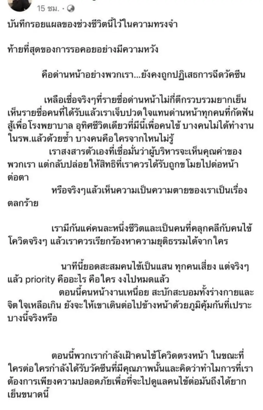 พวกเรากำลังคลุกคลีคนป่วยโควิดที่อยู่ตรงหน้า ในขณะที่ใครต่อใครกำลังได้รับวัคซีนที่มีคุณภาพนั้น? เราต้องการเพียงความปลอดภัยเพื่อที่จะไปดูแลคนไข้ต่อ ทำไมมันถึงได้ยากเย็นขนาดนี้?"