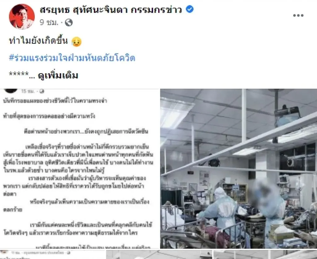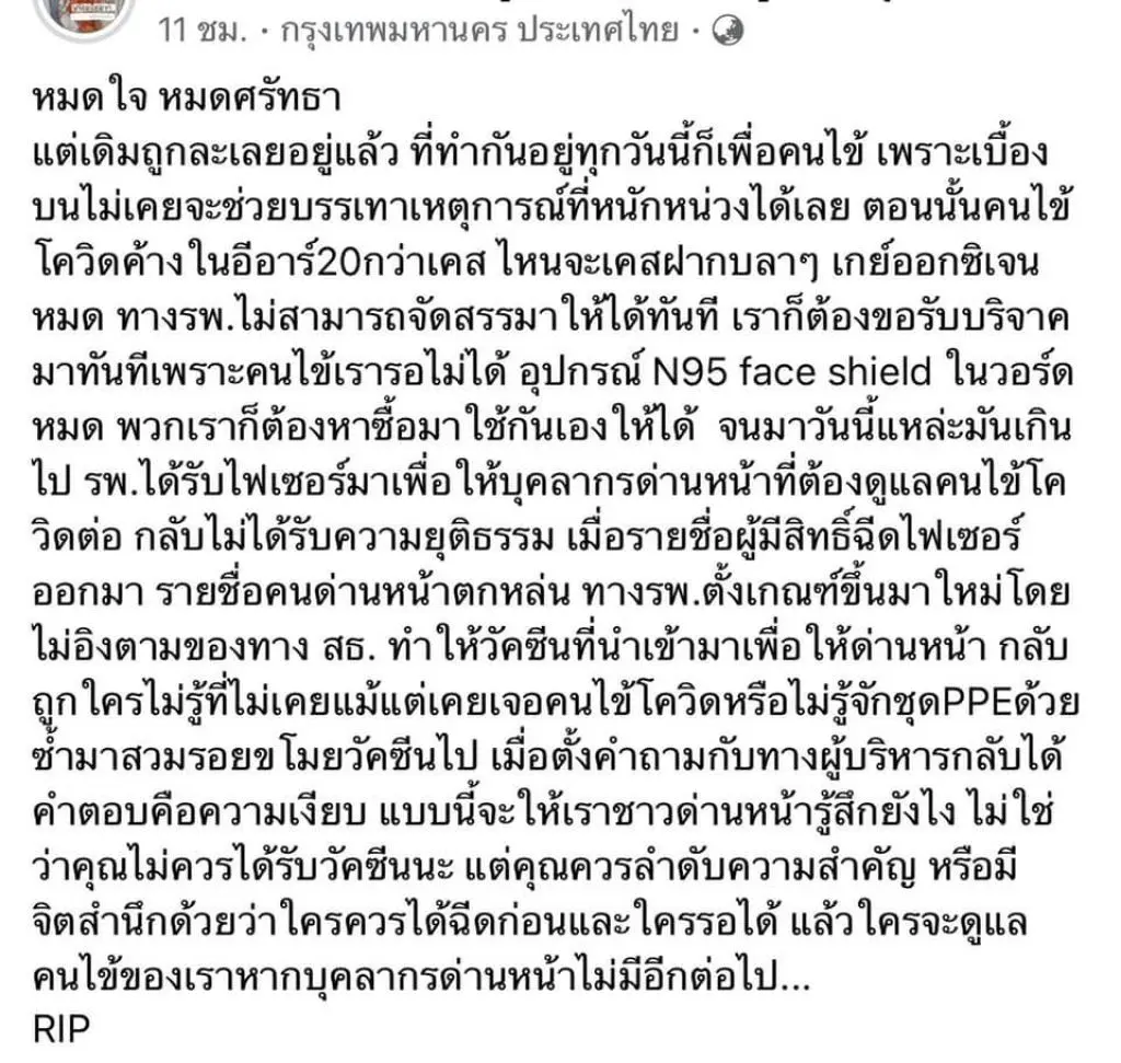 😷💉 "หมดใจ หมดศรัทธา แต่เดิมถูกละเลยอยู่แล้ว ที่ปฏิบัติหน้าที่อยู่ทุกวันนี้ก็เพื่อคนไข้ เพราะเบื้องบนไม่เคยจะช่วยบรรเทาเหตุการณ์ที่หนักหน่วงได้เลย คนไข้โควิดค้างในอีอาร์ 20 กว่าเคส ไหนจะเคสฝากบลาๆ