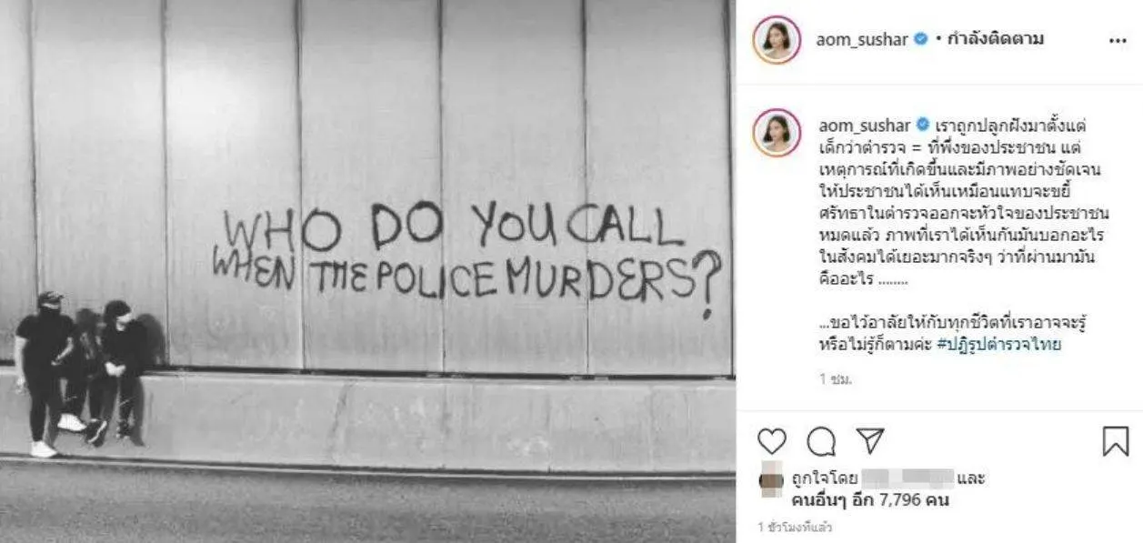 นักแสดงสาว "ออม สุชาร์ มานะยิ่ง" ร้องปฏิรูปตำรวจไทย ก่อนหมดศรัทธา เราถูกปลูกฝังมาตั้งแต่เด็กว่าตำรวจ = ที่พึ่งของประชาชน แต่เหตุการณ์ที่เกิดขึ้นและมีภาพอย่างชัดเจนให้ประชาชนได้เห็นเหมือนแทบจะขยี้ศรัทธาในตำรวจออกจะหัวใจของประชาชนหมดแล้ว ที่ผ่านมามันคืออะไร ขอไว้อาลัยให้กับทุกชีวิตที่เราอาจจะรู้หรือไม่รู้ก็ตามค่ะ #ปฏิรูปตำรวจไทย