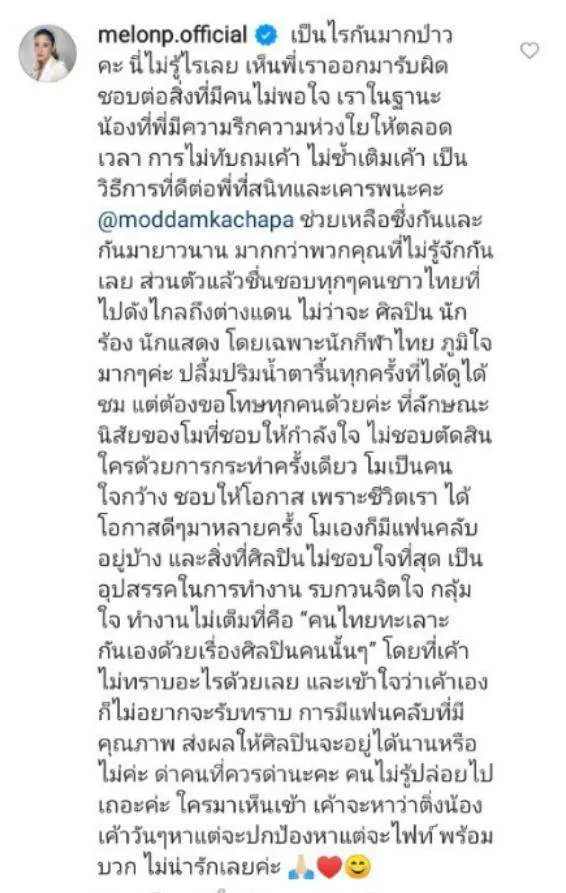“การมีแฟนคลับที่มีคุณภาพ ส่งผลให้ศิลปินจะอยู่ได้นานหรือไม่ค่ะ ด่าคนที่ควรด่านะคะ คนไม่รู้ปล่อยไปเถอะค่ะ ใครมาเห็นเข้า เค้าจะหาว่าติ่งน้อง เค้าวันๆหาแต่จะปกป้องหาแต่จะไฟท์ พร้อมบวก ไม่น่ารักเลยค่ะ” เลยเหรอคะคุณแตงโม คุณพิมพ์ออกมาแบบนี้เลยเหรอ!? มันไม่ใช่เรื่องของคุณแตงโมเนาะ