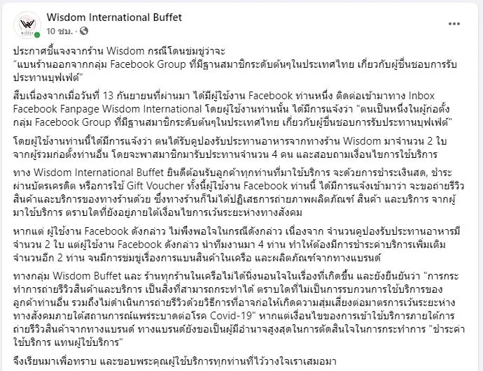 1️⃣เพจเฟซบุ๊กร้าน Wisdom International Buffet ดังกล่าว ได้ออกมาชี้แจง กรณีโดนข่มขู่ว่าจะ “แบนร้านออกจากกลุ่ม Facebook Group ที่มีฐานสมาชิกระดับต้นๆในประเทศไทย โดยระบุว่า..