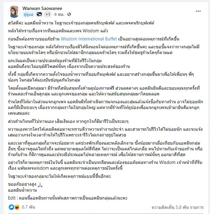 8️⃣แอดมินเจ้าของกลุ่มคนรักบุฟเฟต์ และเพจคนรักบุฟเฟต์ ได้โพสต์ชี้แจงในกลุ่ม โดยระบุว่า "สวัสดีค่ะ แอดมินน้ำหวาน ในฐานะเจ้าของกลุ่มคนรักบุฟเฟต์ และเพจคนรักบุฟเฟต์ หลังได้ทราบเรื่องจากทีมแอดมินและเพจ Wisdom แล้ว ก่อนอื่นต้องกราบขออภัยร้าน Wisdom International Buffet เป็นอย่างสูงต่อเหตุการณ์ที่เกิดขึ้น