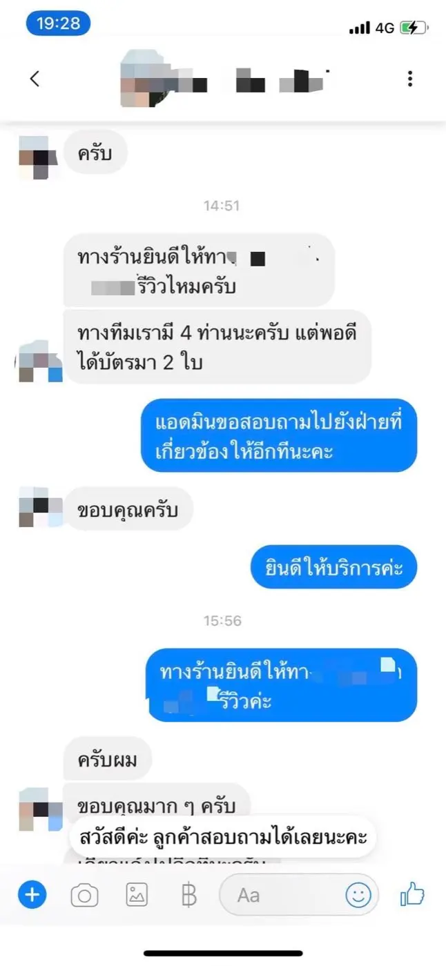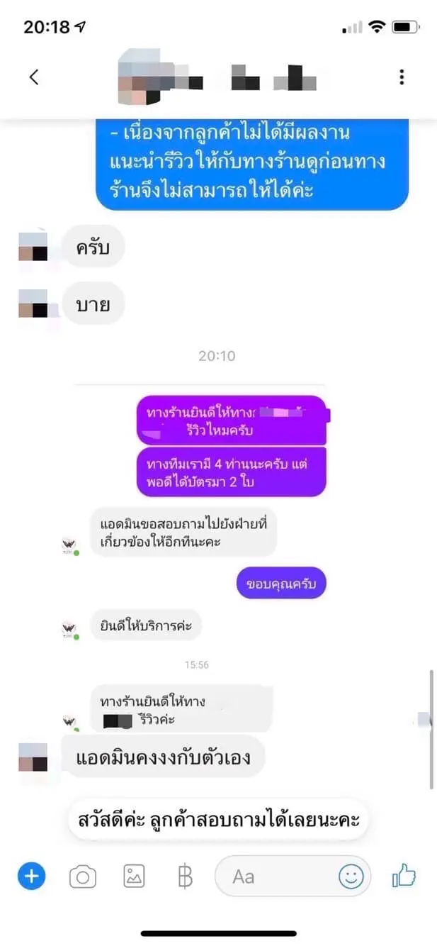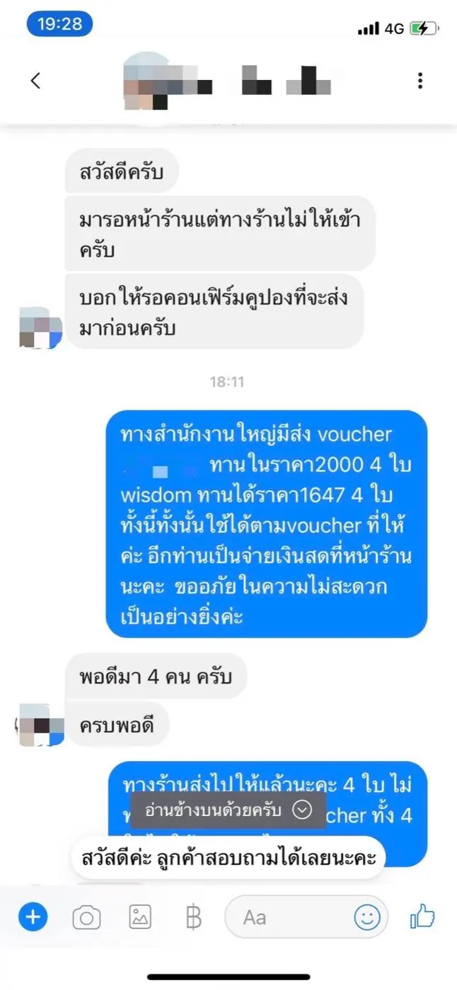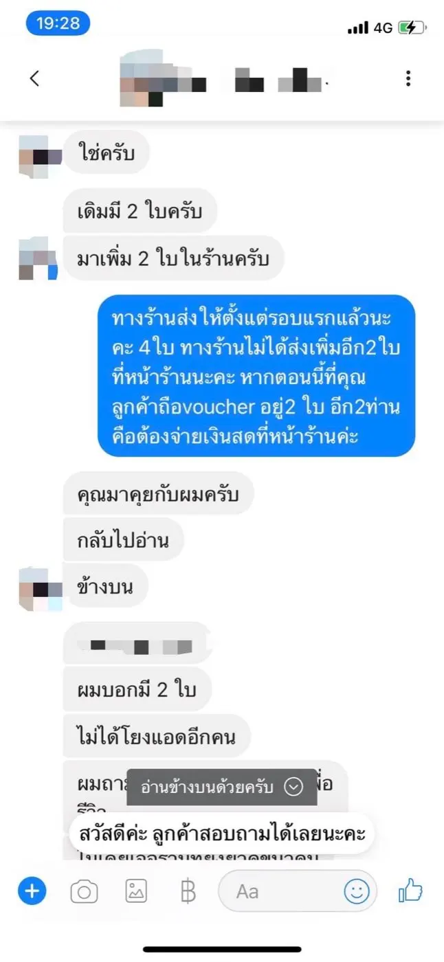 3️⃣แอดมินร้านจึงได้ไปติดต่อสำนักงานและได้แจ้งผู้มารีวิวว่า ทางร้านได้ส่งคูปอง (Voucher) ไปให้ทางกลุ่มรีวิวดังกล่าวแล้วทั้งหมด 8 ใบ ดังนั้น ทางร้าน จึงปฏิเสธที่จะออกคูปองเพิ่มให้ทีมงานอีก 2 คน โดยให้จ่ายเป็นเงินสดที่หน้าร้าน
