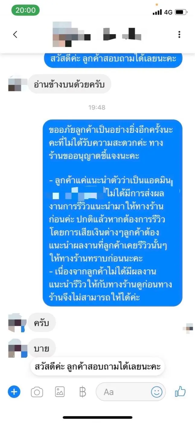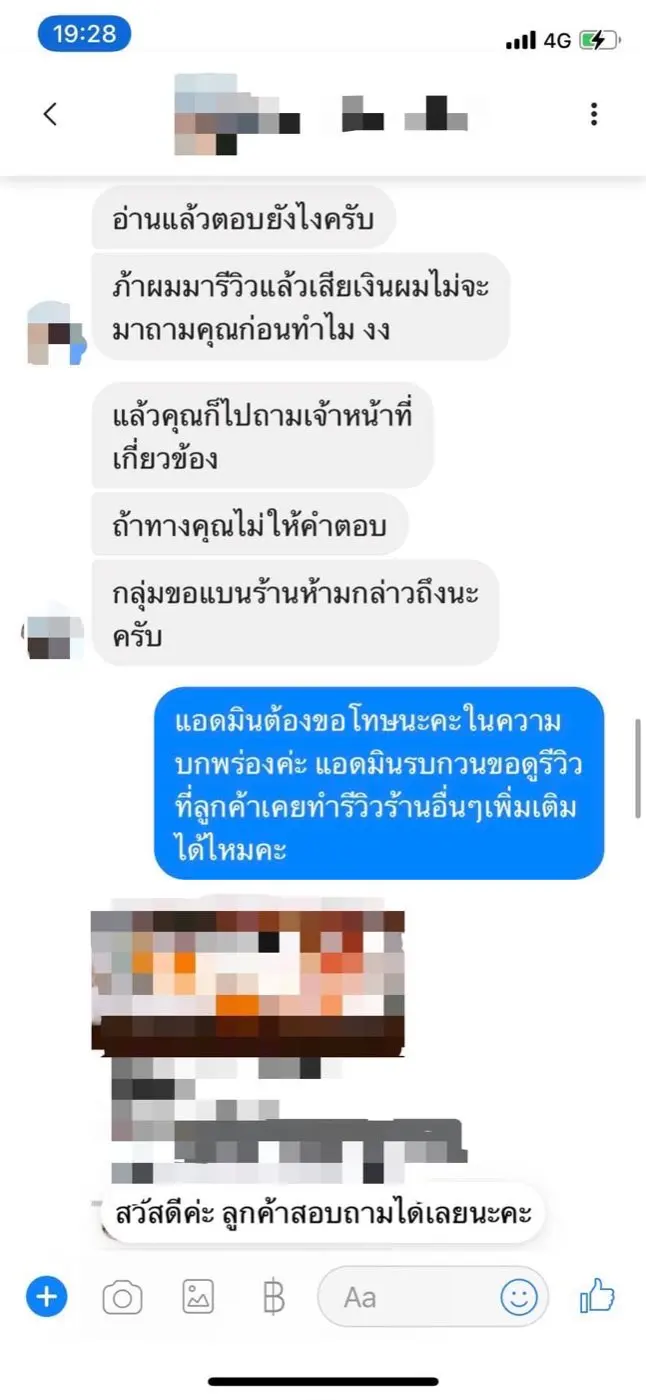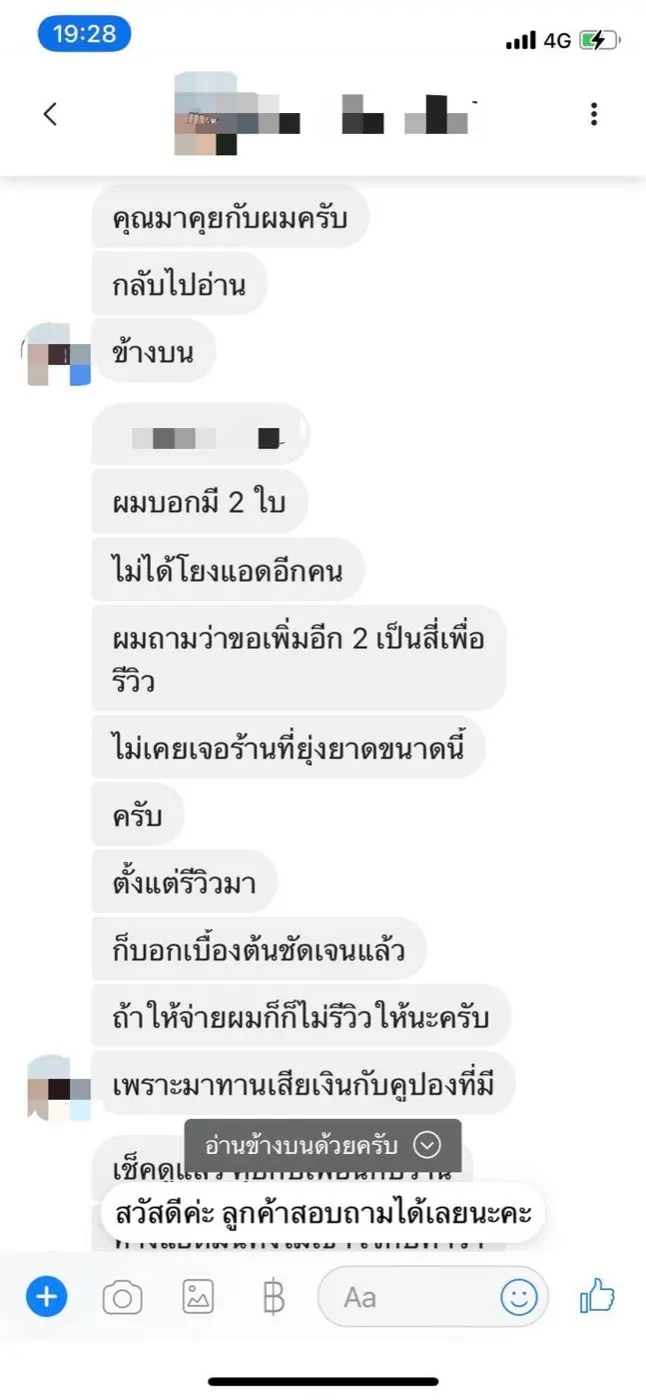 4️⃣แอดมินกลุ่มรีวิวได้แสดงความไม่พอใจ โดยส่งข้อความไปหาทางร้านว่า "ตั้งแต่รีวิวมาไม่เคยเจอร้านที่ยุ่งยากขนาดนี้ ถ้าให้จ่ายเงิน ก็จะไม่รีวิวให้ เพราะมากินก็เสียเงินกับคูปองที่มี โดยแอดมินร้านคงไม่เข้าใจคำว่า "รีวิว" คือการมากินและคนกินไม่เสียเงิน เพราะเป็นการโฆษณาให้ บางร้านยังต้องเสียเงินเพื่อรีวิวให้อีกด้วย ไม่พอใจทั้งร้านและแอดมินร้าน ทางกลุ่มเฟซบุ๊กจึงขอแบนร้านนี้ ห้ามกล่าวถึง"
