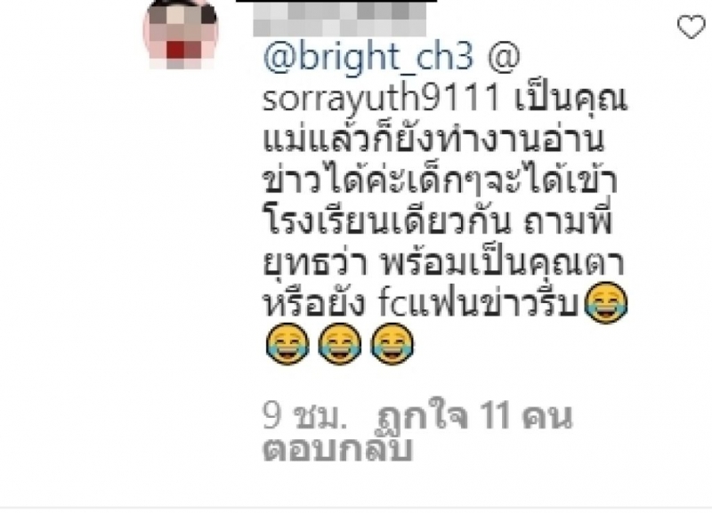 อีกทั้งงานนี้ ไบรท์ พิชญทัฬน์ เคลื่อนไหวแล้วหลัง โต๋ ศักดิ์สิทธิ์ โพสต์ภาพอัลตร้าซาวน์ อยากมีผู้สืบสกุลแต่ไม่ขอกดดัน โดยงานนี้ ไบรท์ พิชญทัฬน์ เมื่อเห็นข้อความ โต๋ ศักดิ์สิทธิ์ ก็เข้ามาเเสดงความคิดเห็นเป็นรูปอิโมจิ ท่ามกลางชาวเโซเชียล ที่เข้ามาคอมเมนต์ต่อว่า @bright_ch3 @ sorrayuth9111 เป็นคุณแม่แล้วก็ยังทำงานอ่านข่าวได้ค่ะเด็กๆจะได้เข้าโรงเรียนเดียวกัน ถามพี่ยุทธว่า พร้อมเป็นคุณตาหรือยัง fc แฟนข่าวรีบ