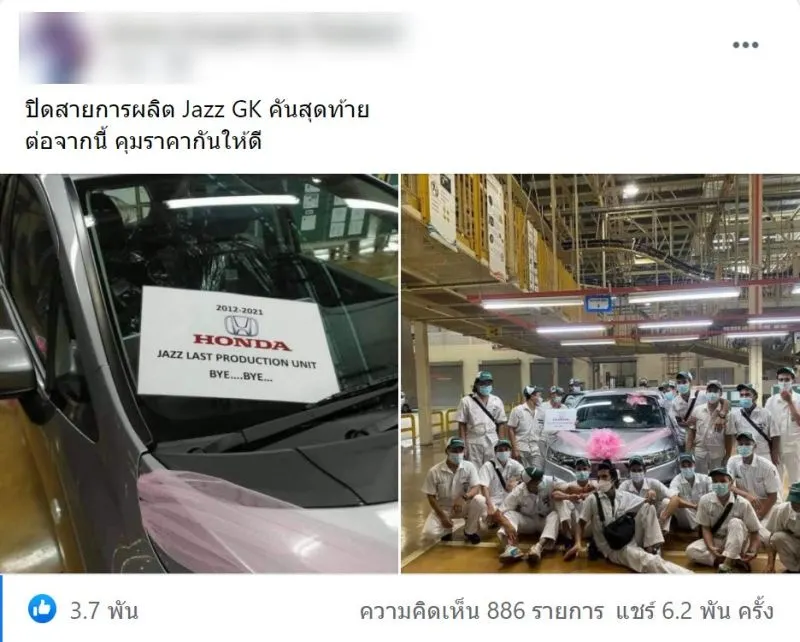 เมื่อวันที่ 15 ตุลาคม โลกออนไลน์มีการแชร์ภาพการผลิต Honda Jazz รถยนต์ซับคอมแพ็กต์รุ่นดังของ ฮอนด้า ที่ทำตลาดในเมืองไทยเป็นเวลายาวนาน โดยได้ผลิตคันสุดท้ายของโรงงานฮอนด้า ที่จ.ปราจีนบุรี มีป้ายเขียนว่า 2012 – 2021 Honda Jazz Last production Unit BYE BYE