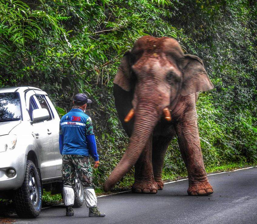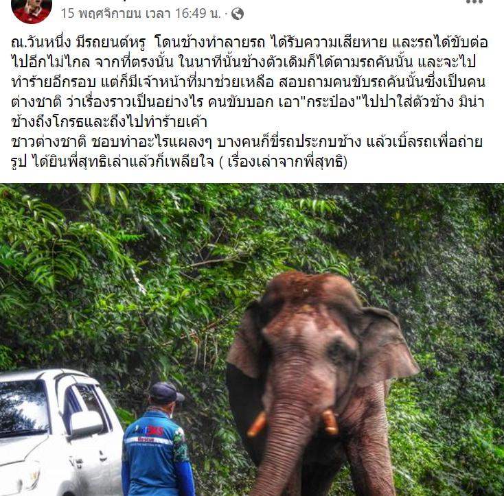 ผู้ใช้เฟซบุ๊ก เผยภาพช้างตัวหนึ่งที่อาศัยอยู่ในอุทยานแห่งชาติเขาใหญ่ (Khaoyai National Park) ท่าทางดูอารมณ์ไม่ดี พร้อมเล่าเหตุการณ์ว่า มีรถยนต์หรูของนักท่องเที่ยวถูกช้างทำลายได้รับความเสียหาย ซึ่งนักท่องเที่ยวได้ขับรถต่อไปอีกไม่ไกลจากบริเวณนั้น ช้างตัวเดิมก็ตามรถมาจะทำร้ายอีกรอบ