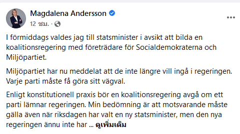หัวหน้าพรรคสังคมประชาธิปไตย "แม็กดาเลนา แอนเดอร์สสัน" ของสวีเดน ได้ถอนตัวจากการเป็น "นายกรัฐมนตรีหญิงคนแรกของสวีเดน" หลังรัฐสภาไม่ผ่านร่างงบประมาณของทางพรรค และ พรรคที่รั่วหัวจมท้ายก็ได้ถอนตัว จากการเป็นพรรคร่วมรัฐบาลของเธอ ซึ่งทำให้พรรคของเธอล้มเหลวเละไม่เป็นท่า!!