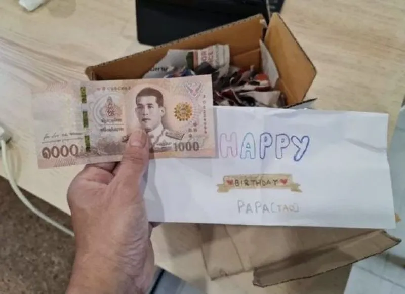 ชิ้นที่? 2? เป็นของ? สมใจ? แอบห่อเก็บไว้ให้? Surprise วัสดุทุกอย่างที่ใช้ รีไซเคิลหมด? ซองจดหมายเก่า? ที่วาดรูป?ด้วยตัวเองและ เขียนคำว่า? Happy Birthday(Papa? TAO) เปิดซอง?ของขวัญ?ออกมา? เซอร์ไพรส์สุดๆ? มีเงินสด? 1,000 สมใจ?บอกว่าเป็นเงินเก็บให้ปะป๊าเป็นของขวัญวันเกิดนะค่ะ ขอให้ปะป๊ามีเงินเยอะๆนะ (เงินก้อนแรกในชีวิตที่ได้จากลูก)