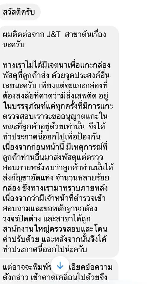 ทางเราไม่ได้มีเจตนาเพื่อแกะกล่องพัสดุที่ลูกค้าส่ง ด้วยจุดประสงค์อื่นเลยนะครับ เพียงแต่จะแกะกล่องที่ต้องสงสัยที่คาดว่ามีสิ่งเสพติด อยู่ในบรรจุภัณฑ์แต่ทุกครั้งที่มีการแกะตรวจสอบเราจะขออนุญาตแกะในขณะที่ลูกค้าอยู่ด้วยเท่านั้น จึงได้ทำประกาศนี้ออกไปเพื่อป้องกัน เนื่องจากก่อนหน้านี้ มีเหตุการณ์ที่ลูกค้าท่านอื่นมาส่งพัสดุแต่ตรวจสอบภายหลังพบว่าลูกค้าท่านนั้นได้ส่งกัญชาอัดแท่ง จำนวนหลายร้อยกล่อง ซึ่งทางเรามาทราบภายหลัง เนื่องจากว่ามีเจ้าหน้าที่ตำรวจเข้าสอบถามและขอหลักฐานกล้องวงจรปิดต่าง และสาขาได้ถูกสำนักงานใหญ่ตรวจสอบและโดนค่าปรับด้วย และหลังจากนั้นจึงได้ทำประกาศนี้ออกไปน่ะครับ”