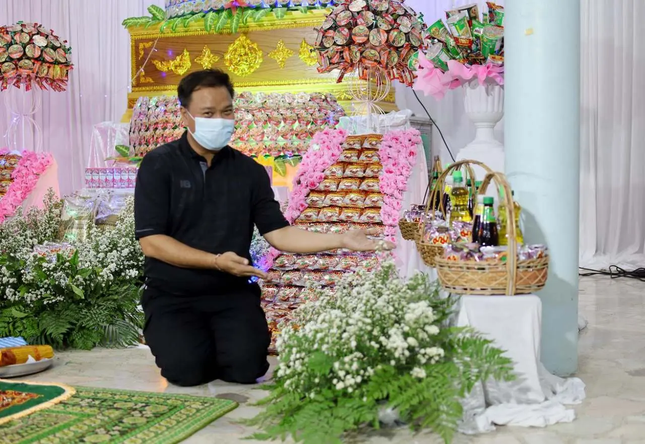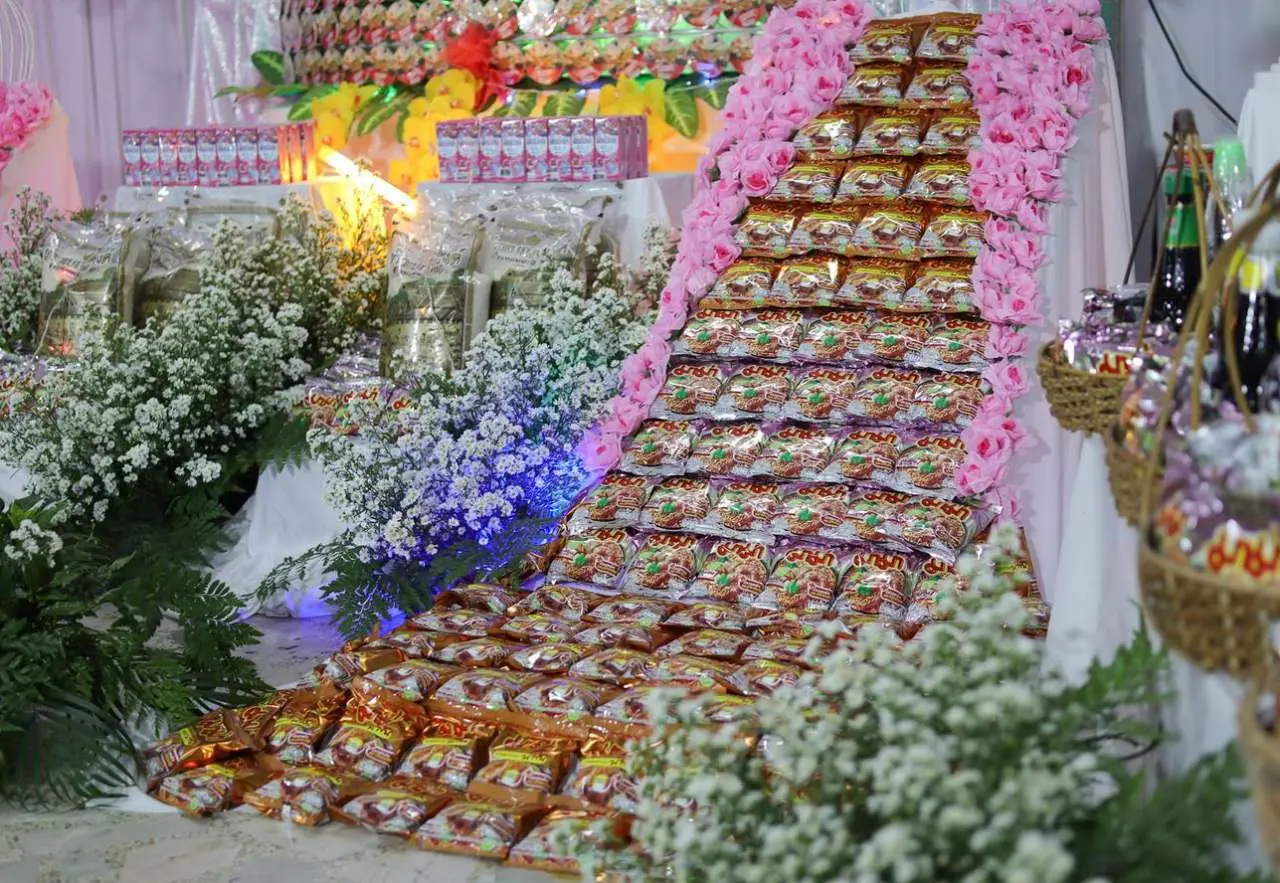 ซึ่งอาหารแห้ง ประกอบด้วย บะหมี่กึ่งสำเร็จรูปแบบซอง บะหมี่กึ่งสำเร็จรูปแบบถ้วย ข้าวสาร ปลากระป๋อง นมกล่อง กาแฟซองและน้ำมันพืช ส่วนด้านค่าใช้จ่ายนั้น ทางญาติแจ้งว่าพอๆกับการแต่งด้วยดอกไม้สด แต่ข้าวของสามารถนำไปใช้ประโยชน์ต่อได้อีก