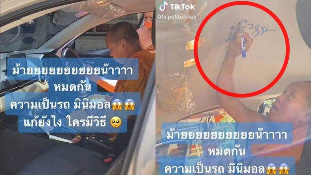 สาวร้องจ๊าก! ขณะ หลวงพ่อใช้ปากกาเคมี บรรจงเขียนยันต์บนหลังคารถ คันใหม่