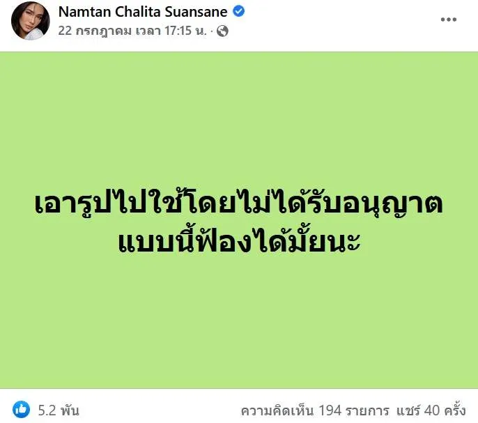 "น้ำตาล ชลิตา" จ่อฟ้อง "เพชร ปากปลาร้า" หลังตัดต่อรูปแบบนี้